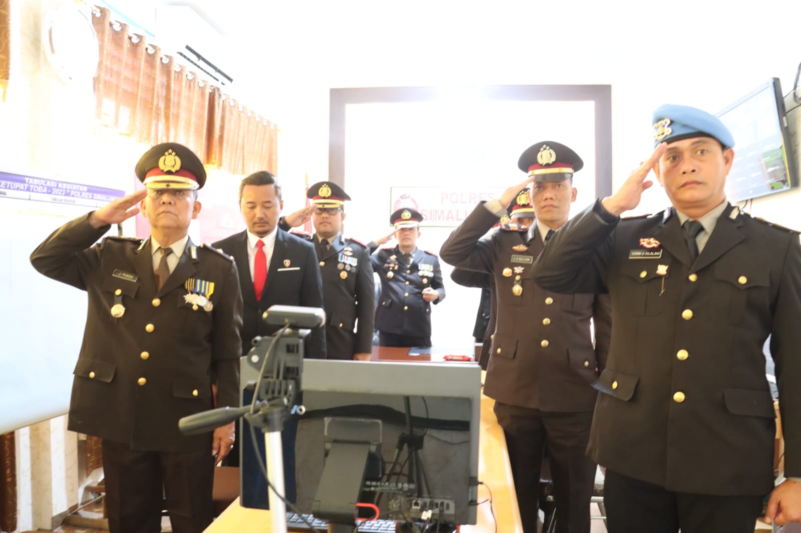 Simalungun, swarabhayangkara.com – Pada Sabtu, 1 Juli 2023, Polres Simalungun bersama-sama dengan Kapolres Simalungun, AKBP Ronald F.C Sipayung, S.H., S.I.K., M.H., mengikuti upacara peringatan Hari Bhayangkara Ke 77 tahun 2023 secara virtual. Upacara berlangsung mulai pukul 15:00 WIB hingga selesai, yang bermarkas di Ruang Rapat Kantor SATPAS Sat Lantas Polres Simalungun, Jl. Asahan KM.6 Desa Lestari Indah Kecamatan Siantar, Kabupaten Simalungun.