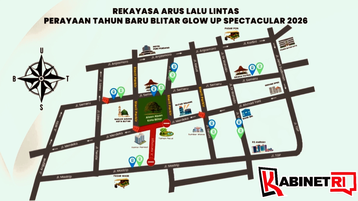 Adapun ruas jalan yang akan ditutup pada malam Tahun Baru 2026 yakni sebagian Jalan Merdeka, mulai dari simpang empat Jalan Seruni hingga depan halaman Kantor Wali Kota Blitar. Penutupan ini dilakukan secara situasional, menyesuaikan dengan kondisi arus lalu lintas di lapangan.