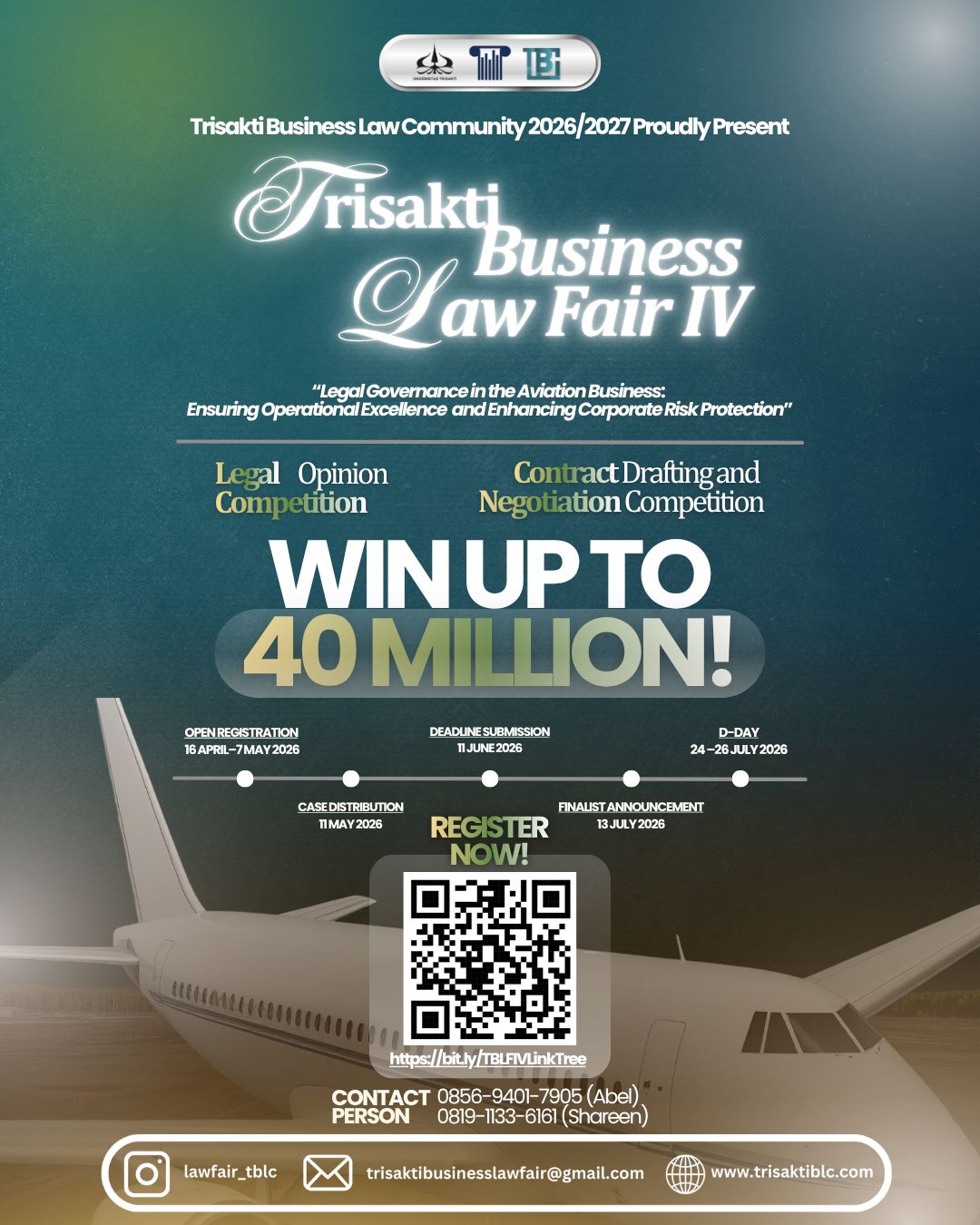 Pendaftaran Trisakti Business Law Fair IV 2026 dibuka pada 16 April hingga 7 Mei 2026 dan terbuka bagi mahasiswa aktif program studi hukum di seluruh Indonesia. Informasi lebih lanjut terkait pendaftaran, teknis perlombaan, serta rangkaian acara dapat diakses melalui Instagram resmi di @lawfair_tblc, email trisaktibusinesslawfair@gmail.com, serta melalui tautan pendaftaran berikut: https://linktr.ee/TrisaktiBusinessLawFairIV.